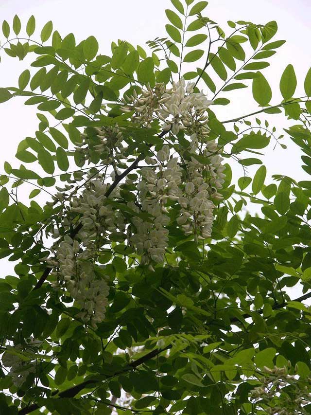 刺槐,又名洋槐。拉丁文名:Robinia pseudoacacia L.豆科、刺槐属落叶乔木,树皮灰褐色至黑褐色,浅裂至深纵裂,稀光滑。 原生于北美洲,现被广泛引种到亚洲、欧洲等地。刺槐树皮厚,暗色,纹裂多;树叶根部有一对1~2mm长的刺;花为白色,有香味,穗状花序;果实为荚果,每个果荚中有4~10粒种子。刺槐木材坚硬,耐腐蚀,燃烧缓慢,热值高。